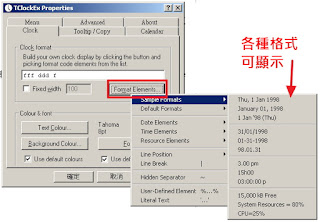 TClockEx 可以自訂要顯示的格式,包含日期、星期、時間,甚至記憶體等等資訊,也可以變換字體。另外預設在上面按一下就可以彈出月曆,還可自訂提示氣泡內容...自己試試看吧!